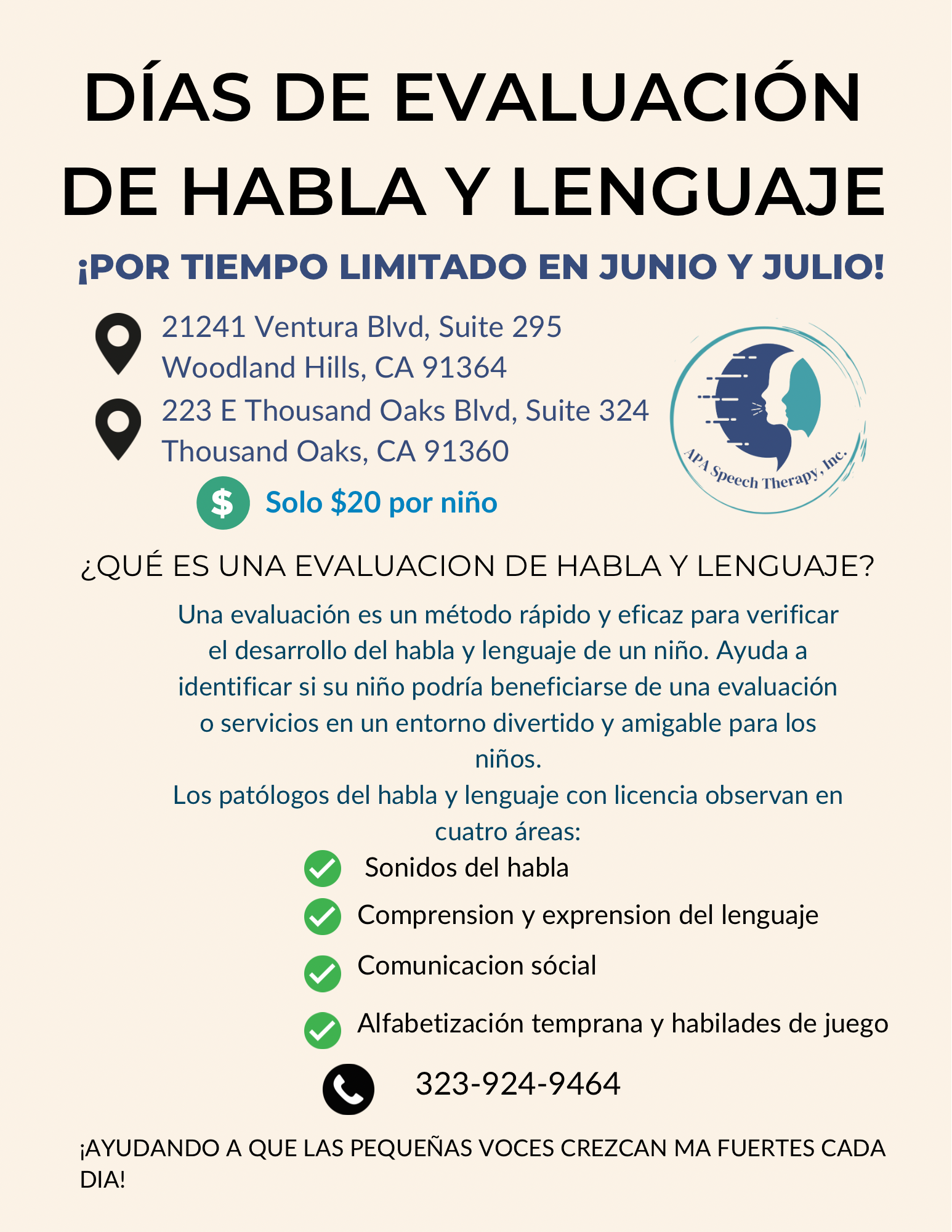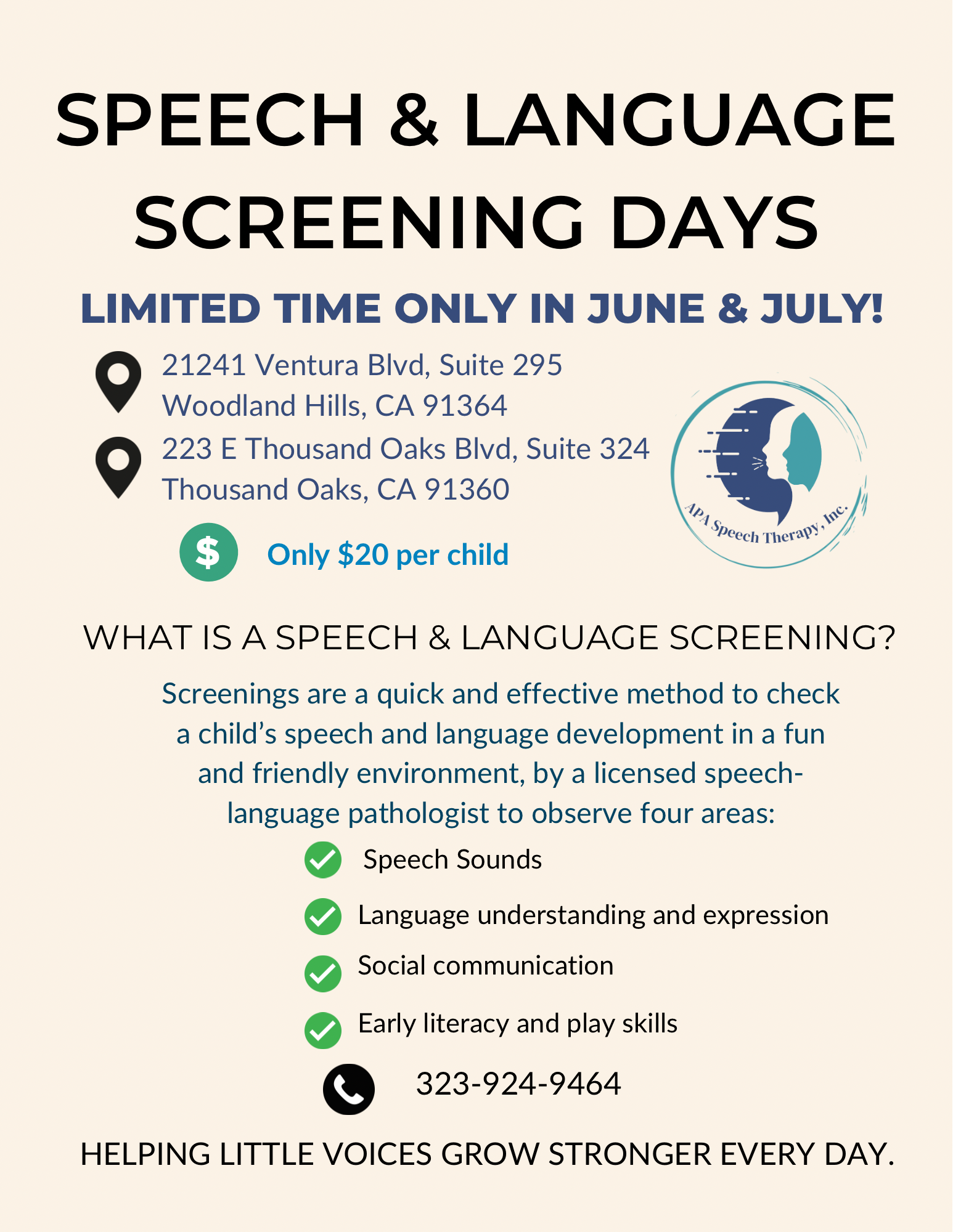 Are you searching for a speech therapy evaluation near Woodland Hills or Thousand Oaks? Do you need a speech and language screening for your child in Ventura County or the San Fernando Valley? APA Speech Therapy is offering low-cost speech and language screenings for a limited time—only $20 per child this June and July!